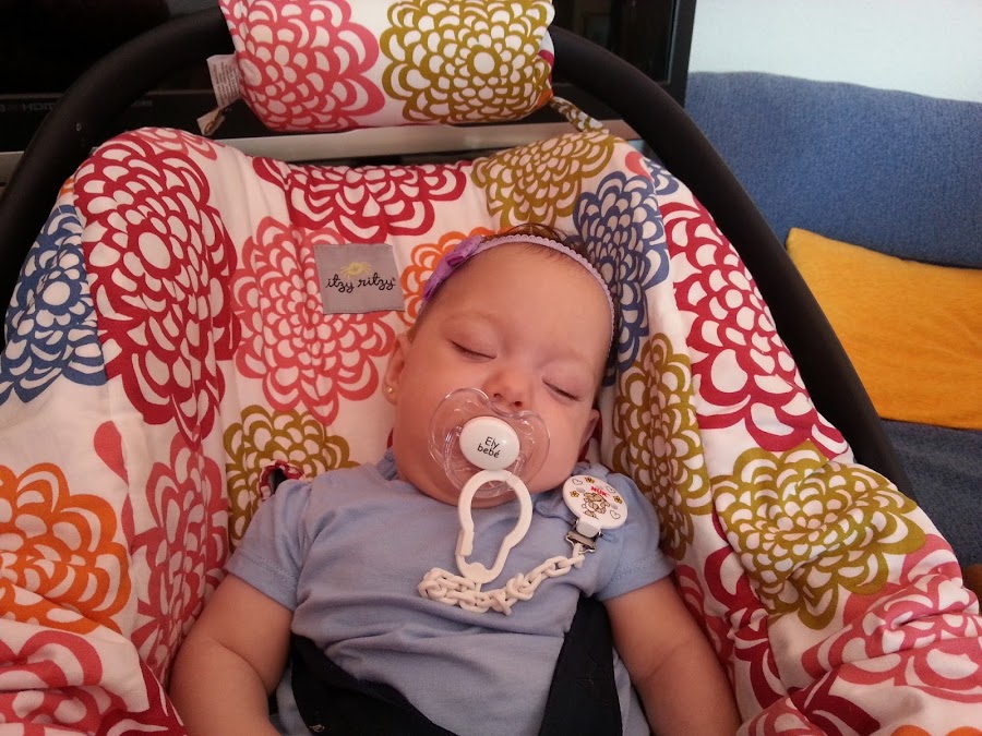 Posteriormente y ya de cara al verano decidí dar al portabebés otro toque más fresquito y también femenino, sobre todo porque el tejido de la funda original es un tanto áspero, así que encontré la solución en las de Itzy Ritzy. Nuestro modelo es el Fresh Bloom, aunque veo que ahora mismo no se encuentra disponible en la web y por eso os enlazo al modelo Rodeo Drive, pero hay una variedad de ellos para todos los gustos. También viene la funda de la capota y a juego se le puede acompañar con la almohadilla para sujetar el asa como podéis ver en la foto, y una cubierta para ponerla en los pies del bebé para que no pase frío. Y como veis, Ely está en la gloria, con su chupete para el momento de dormir, después lo tira y ya no le hace falta.