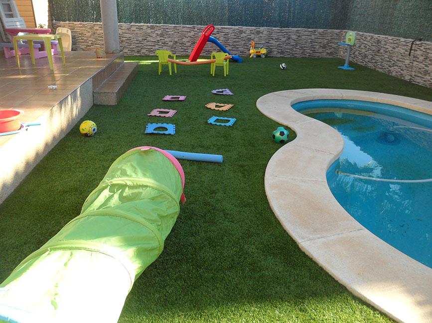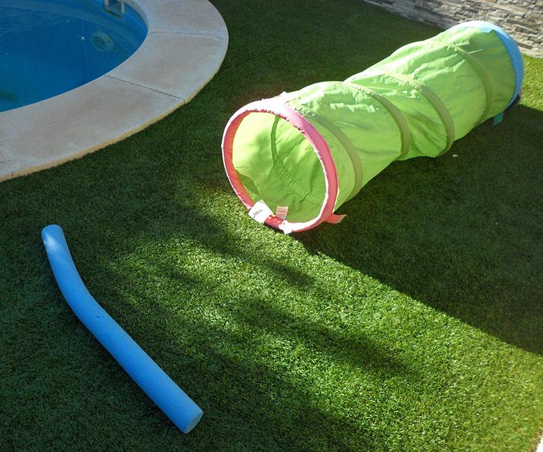 Primero tenían un túnel de esos de plástico del Ikea, que son geniales para cualquier momento del año y dan mucho juego tanto en casa como en el jardín. Además, es súper plegable y se guarda sin problemas. A continuación venía un simple churro de piscina, colocado de manera perpendicular al túnel y un poco alejado de éste.