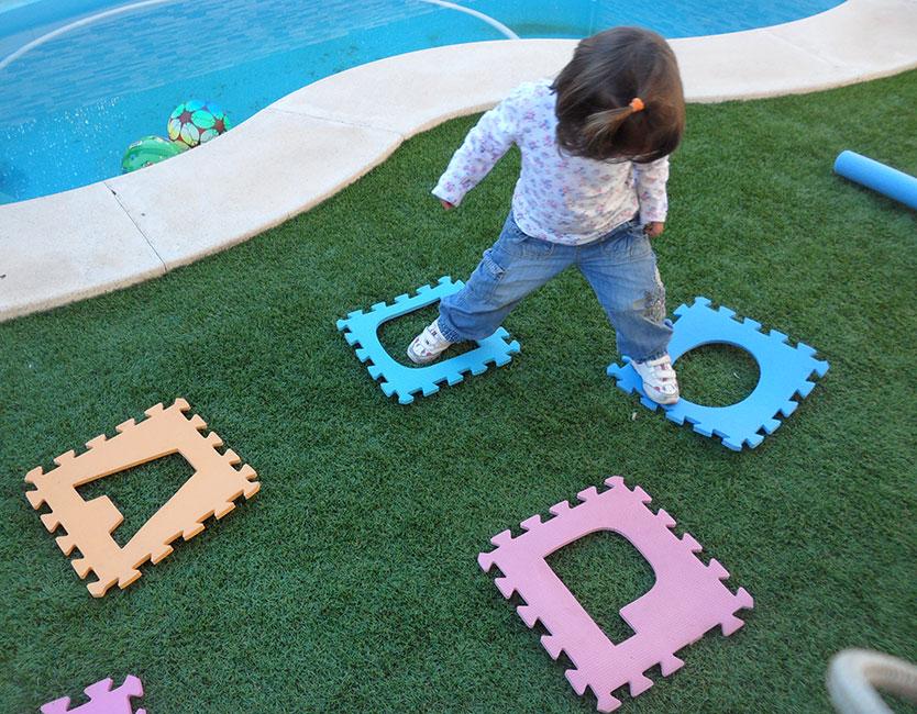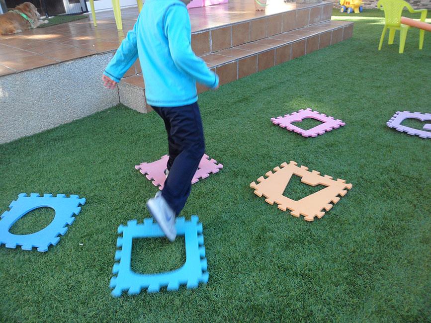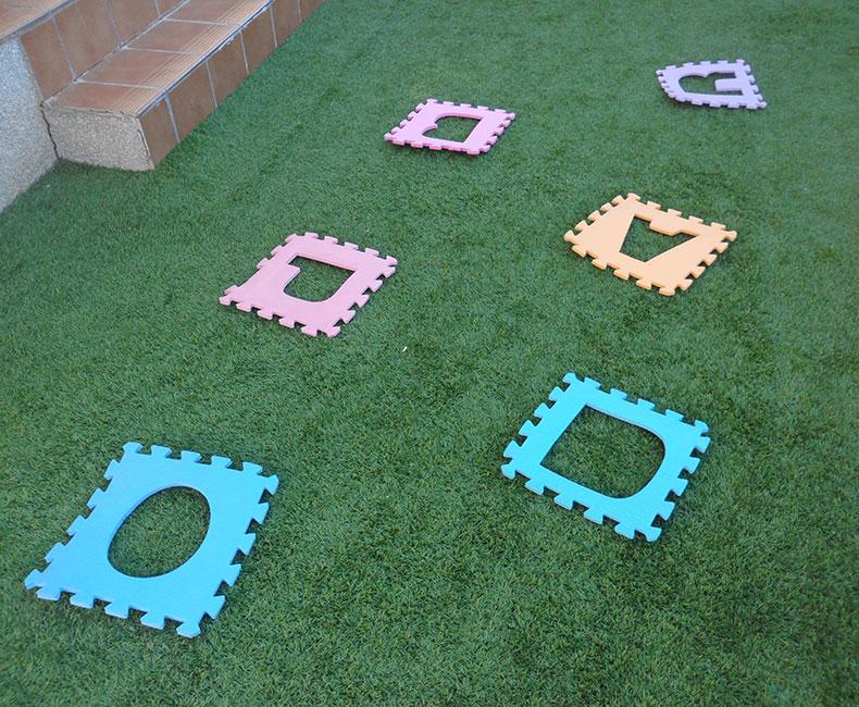 Lo siguiente que colocamos fueron las típicas letras de goma eva para el suelo, pero con las letras quitadas, dejando los agujeros libres. Las colocamos como en zig zag y a poca distancia entre ellas, para que pudieran llegar sin problemas.