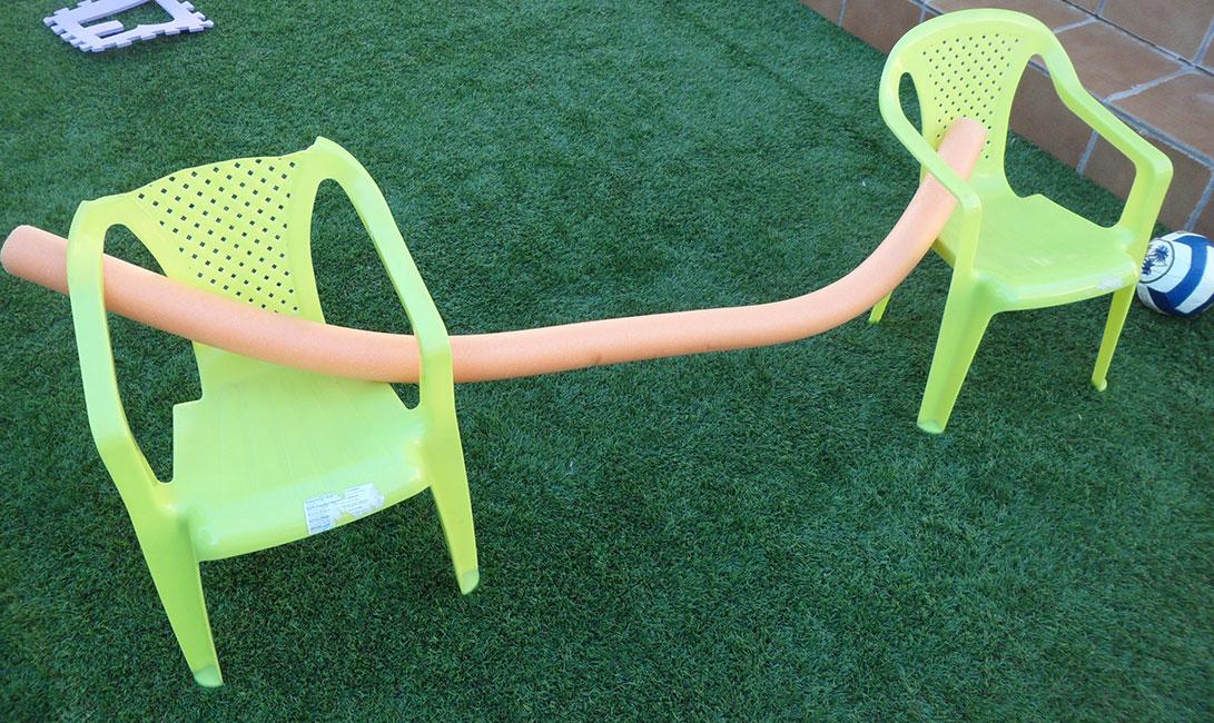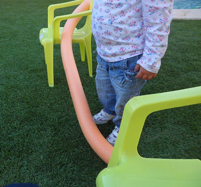 La ventaja de los churros es que, si los huecos de las sillas están muy altos, podéis deformarlos para que la valla a saltar se quede a una altura adecuada para los peques.
