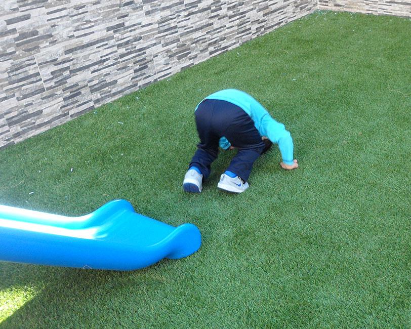 Como os comentaba antes, entre el tobogán y la canasta, había un hueco más o menos grande, situado adrede para incorporar una habilidad más, LA VOLTERETA. Como el césped está blandito, hacen volteretas todo lo que quieren, así que no podía faltar en nuestro circuito psicomotriz. El mayor es un experto en voltereta ya y la pequeña, pues está en su proceso de aprendizaje y sale un poco voltereta-croqueta, jeje.