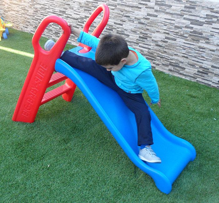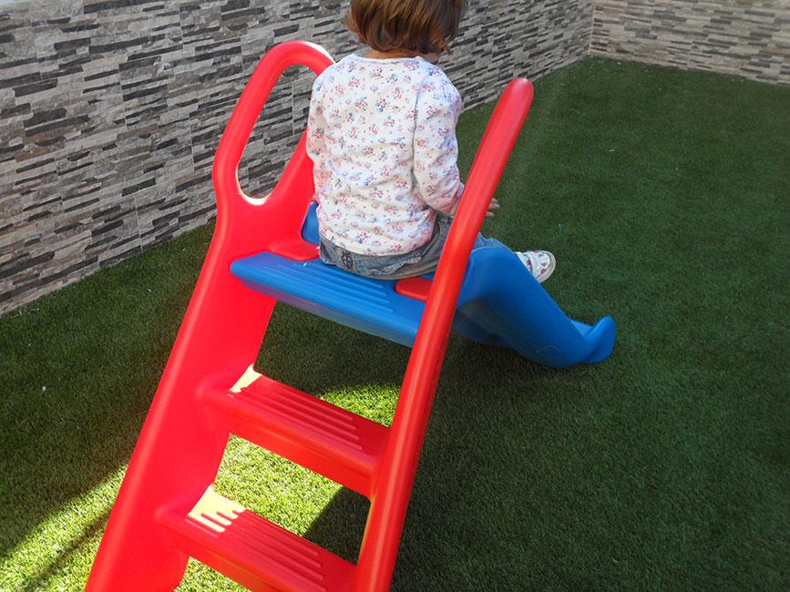Como podéis ver, el bajar el tobogán al revés suponía mucho reto, así que cuando lo intentó su cuerpo se fue girando hasta que se quedó en modo “spagat” total… Pero bajó que era lo importante.
