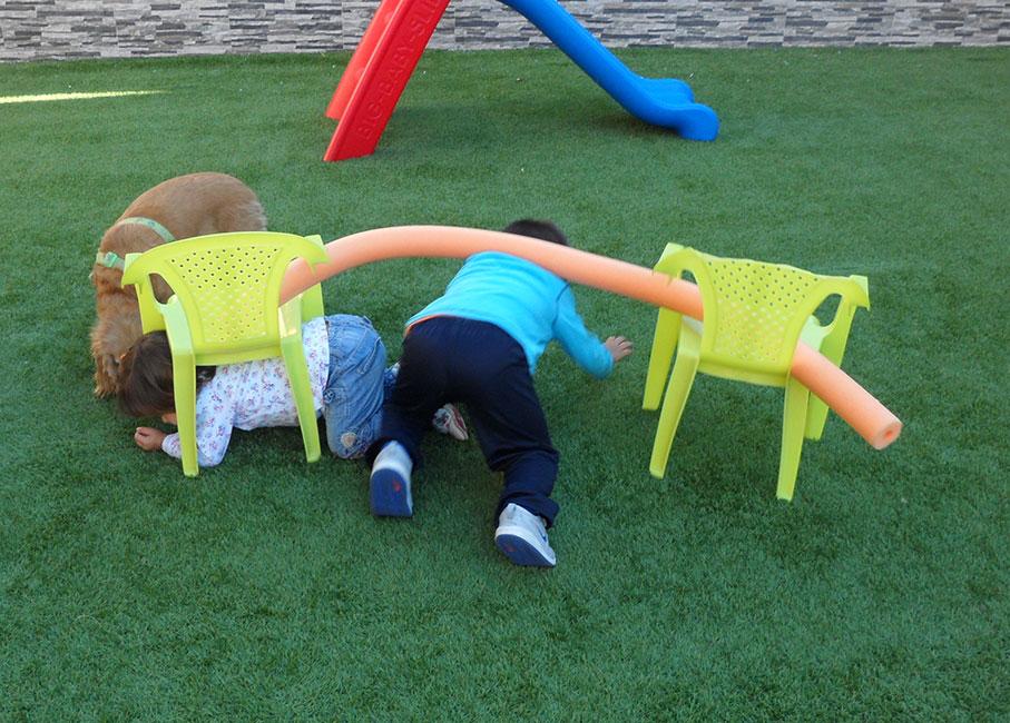 La peque ya estaba pasando por debajo del churro, de las sillas y de lo que hiciera falta, ante la observación e investigación curiosa de la perra que no entendía que hacía por ahí debajo, jejeje. Después, el tobogán tenían que bajarlo de espaldas y la voltereta se convirtió en croqueta, jajajaja.