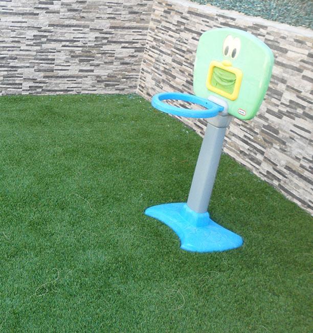 Si no tenéis un tobogán, podéis pensar en hacer otra valla para que pasen por debajo o se arrastren, poner dos escaleritas juntas para que suban y bajen, un montón de churros o elemento similar, seguidos con poca distancia entre ellos de manera que tengan que saltar entre los huecos, un aro o hula hop por el que tengan que pasar, o cualquier cosa que tengáis que puedan pasar por encima o debajo. Después del tobogán había un espacio libre y por último una canasta.