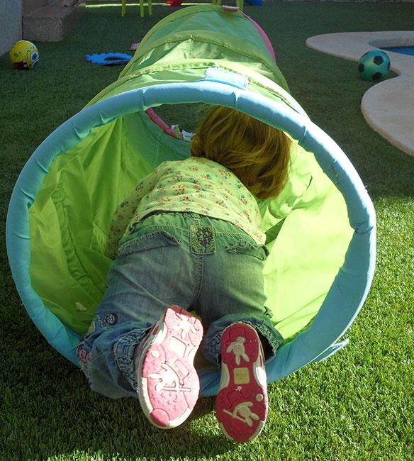 A continuación pusimos la voltereta antes de la valla, ya que ¡¡¡se nos había olvidado!!! Jajaja. Y luego el resto del circuito igual, la valla, las letras, el churro y el túnel. La pequeña ya no siguió mucho el circuito del revés, se dedicó a hacer aquellas partes que le gustaban.