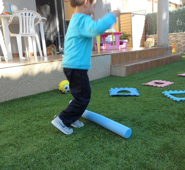 Lo siguiente era una valla de salto casera, como para practicar atletismo. Lo más fácil para hacerlo es usar dos sillas infantiles que tengáis por casa, cuyo respaldo tenga un agujero o bien de las de plástico infantiles que tienen reposa-brazos con hueco por debajo. Cogéis otro churro de piscina y lo sujetáis con los huecos de las sillas. También he visto por ahí hacerlas con varios churros y dos conectores de churros de piscina (que no se si tienen un nombre concreto), colocados en forma de H, pero con la barra de salto a la altura adecuada para el niño.