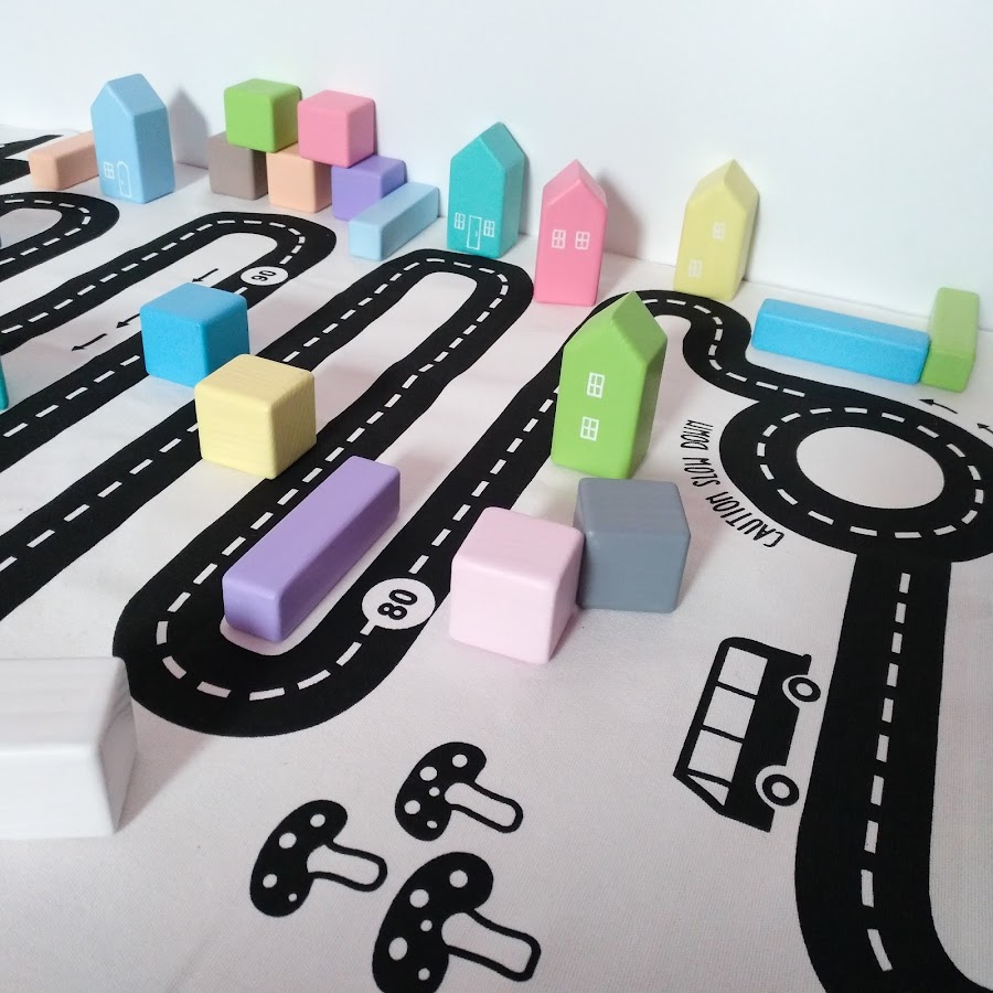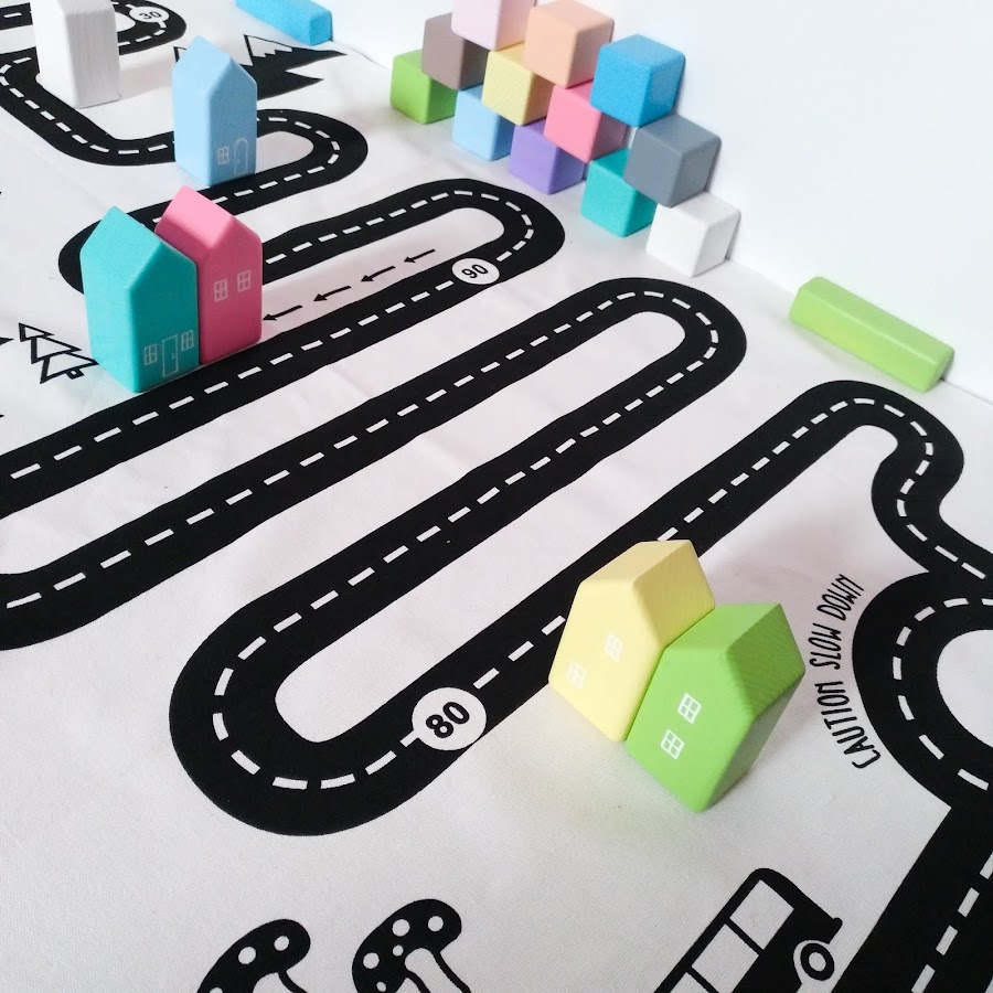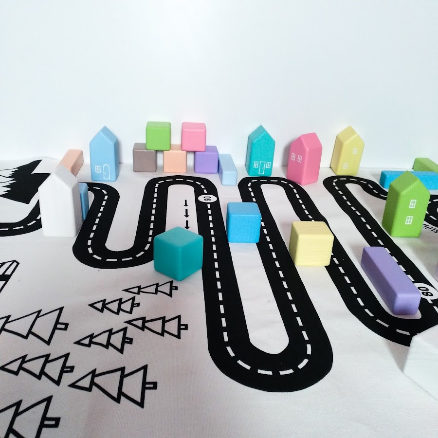 Y no me extraña...reconozco que voy a pasar muchísimas horas jugando con ellos sobre esta alfombra. Esas casitas, esos cubos y esos palos...me tienen loca, y estoy deseando que creemos juntos mil historias.