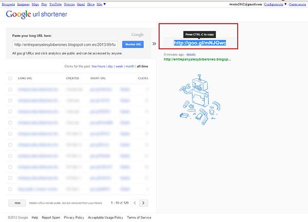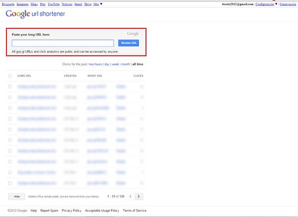Google URL ShortenerTan sencillo como pegar la URL que deseas acortar en el cajetín situado bajo «paste your long URL here» y pulsar seguidamente sobre el botón «Shorten URL». Google URL Shortener nos devolverá entonces una nueva URL mucho más corta.