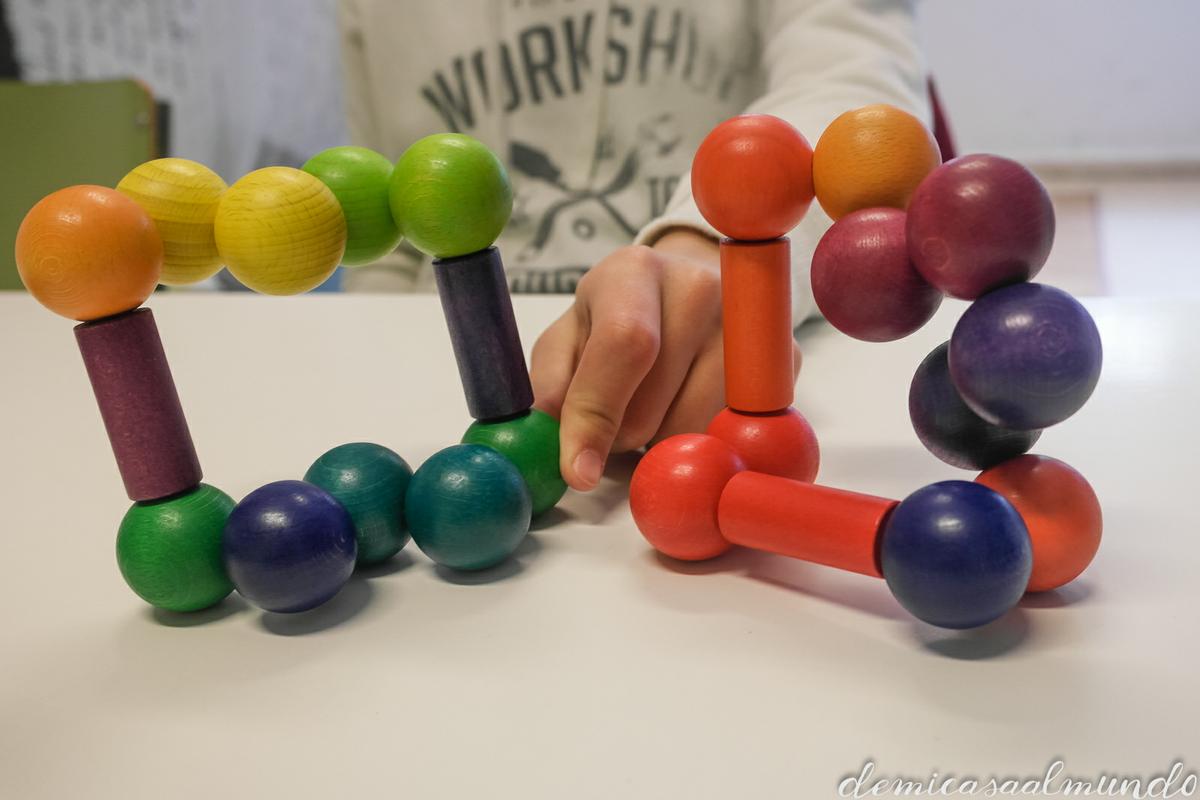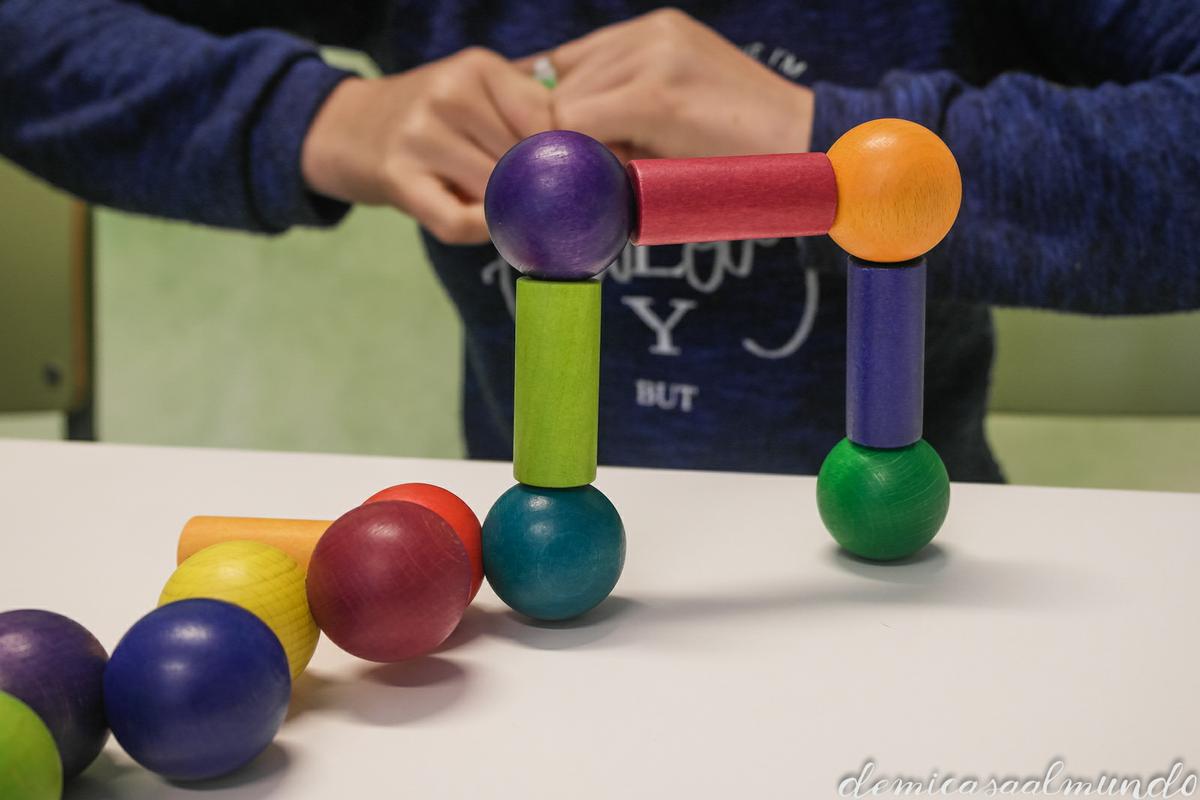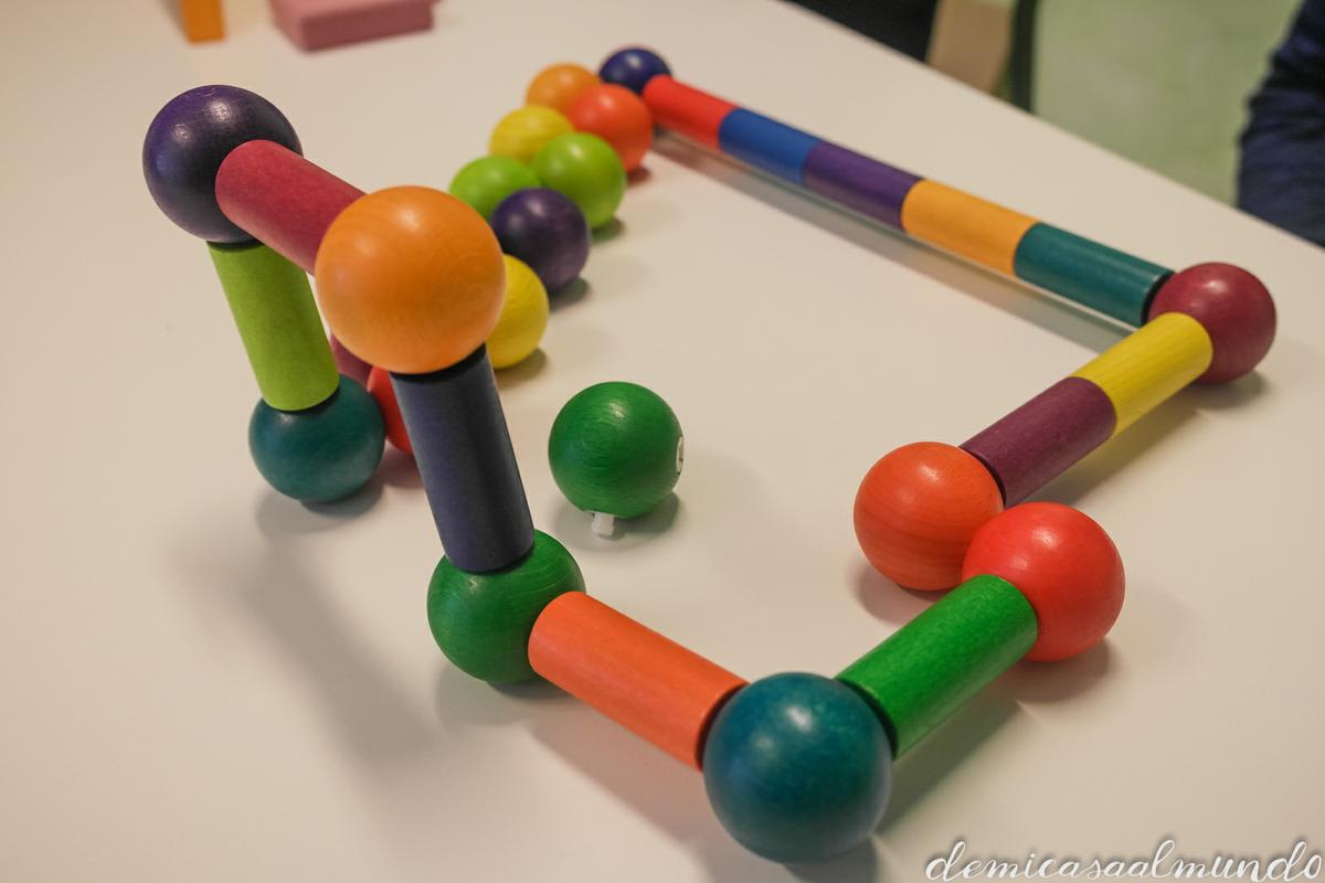 Son tantas las opciones y posibilidades que permiten estas bolas de madera conectables que no sé por dónde empezar: obras de arte, formas geométricas, usos de juego simbólico, construcciones, juegos motrices,… hasta simplemente una experiencia sensorial relajante y agradable al manipular el material.