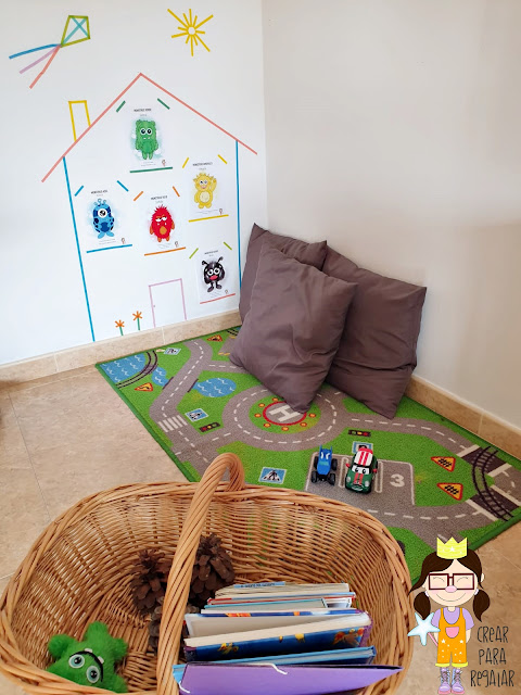 Incorporamos elementos que lo hacían acogedor como la alfombra decorada con un circuito y cojines.
