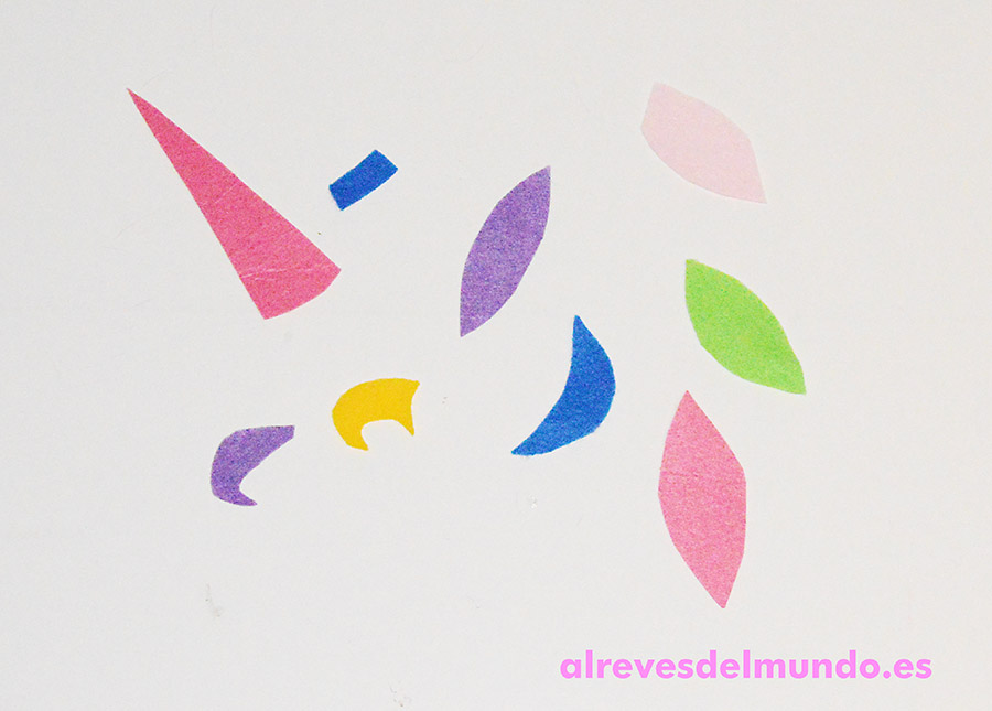 - Cortamos trozos de distintos tamaños y colores para hacer la cabellera y el cuerno