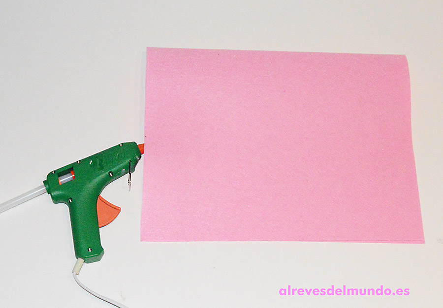 - Doblamos a la mitad un pliego grande de fieltro y pegamos los laterales menos un trocito, por donde meteremos el relleno