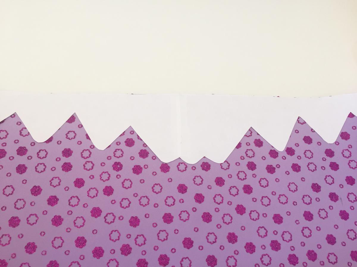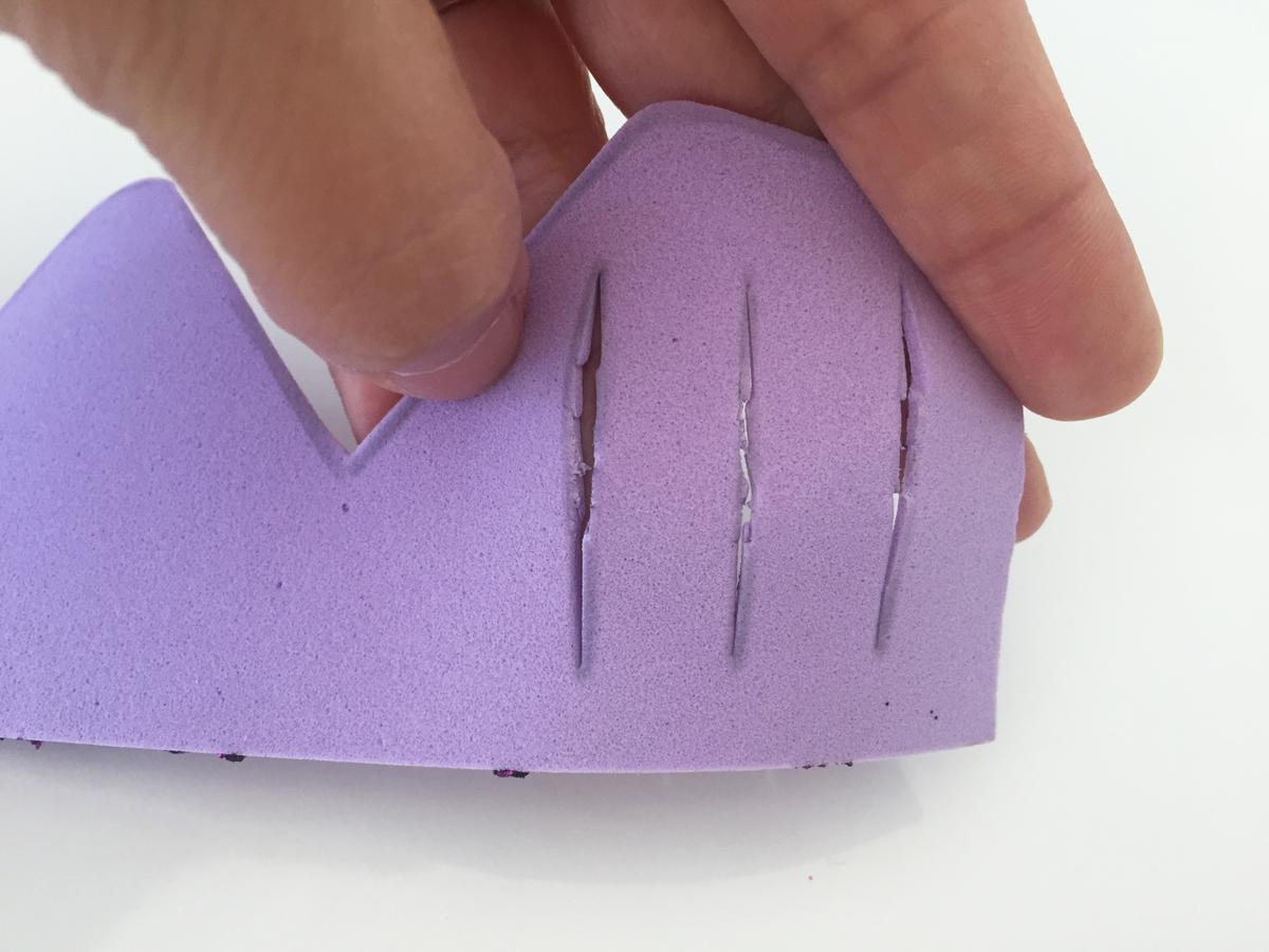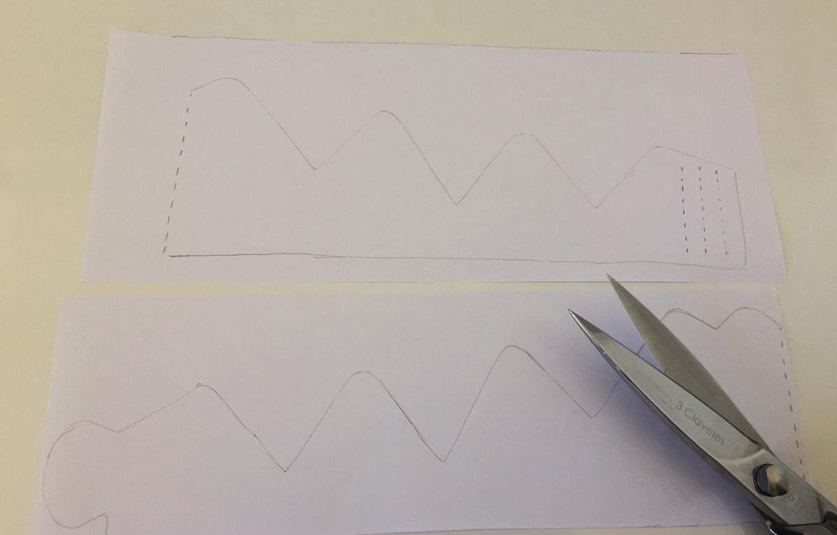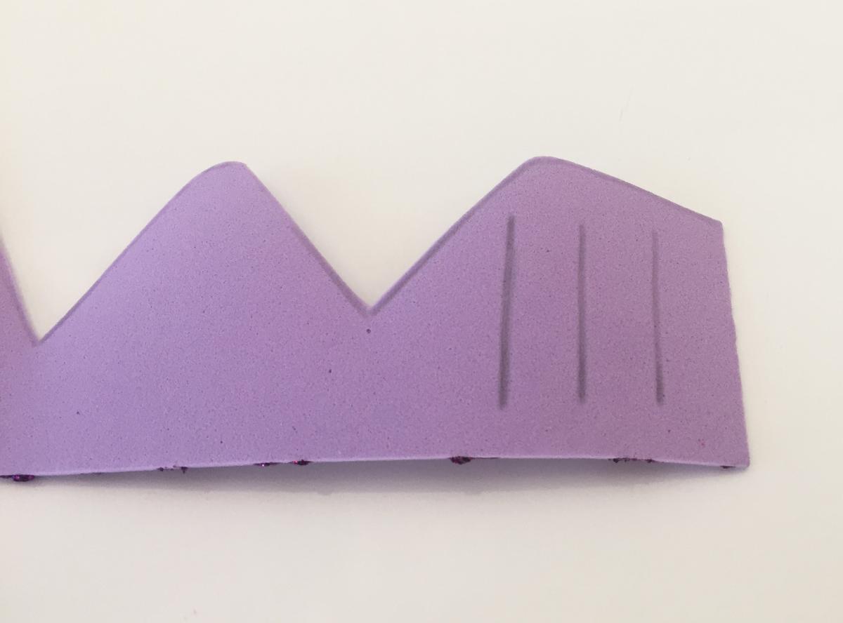 Una vez ya tenemos la forma de la corona hecha, lo siguiente que tenemos que hacer es marcarles con las mismas tijeras tres lineas verticales con la separación de 0,5 cm entre ellas, en la parte contraria donde está la forma redondeada. Esto nos permitirá después adaptarla a la cabeza del niño.
