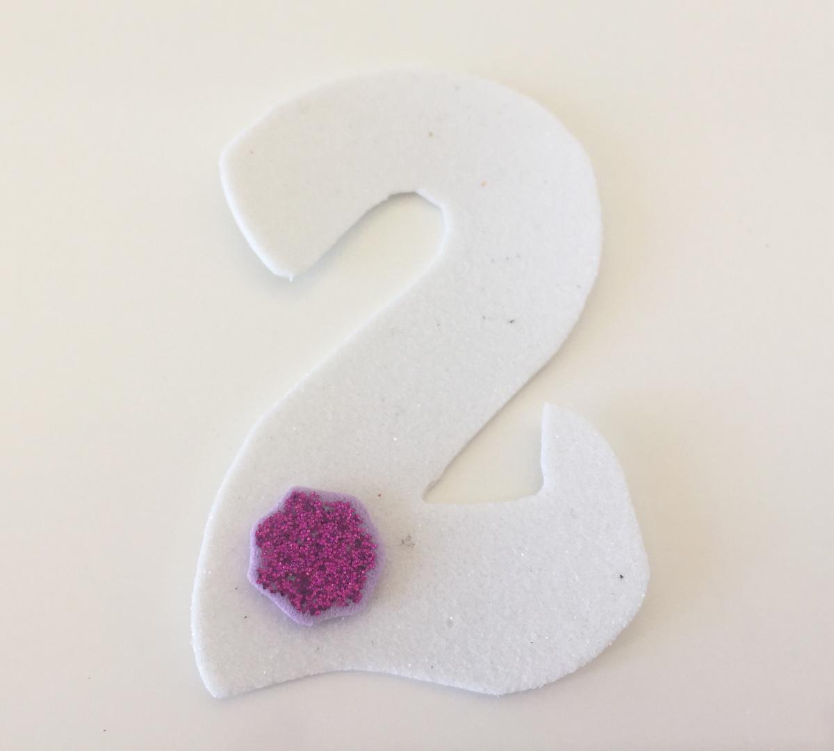 Este paso es opcional, pero yo lo he probado y me gusta como queda. Del mismo Goma Eva, he recortado un trocito del dibujo, dándole forma de flor y lo he pegado en el número. Así queda con más contraste y se ve más bonito.