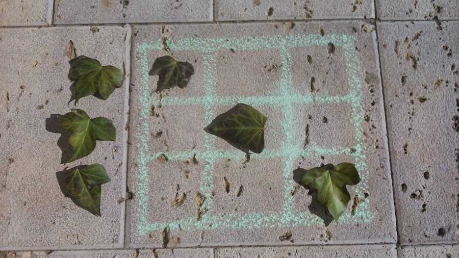 Buscas cualquier cosa que te pueda servir de ficha: 3 Hojas de los árbol y 3 piedras, para diferenciar los jugadores.