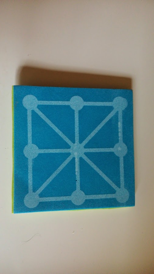 2. En el otro cuadrado de "goma eva" dibujas un cuadrado y unes los puntos entre sí incluyendo el medio. Salen 9 puntos, que se unen entre ellos, formando 3 filas y 3 columnas. Marcas con rotulador, más gruesos los puntos que las líneas que se unen entre sí, para diferenciar bien cuales son las casillas.