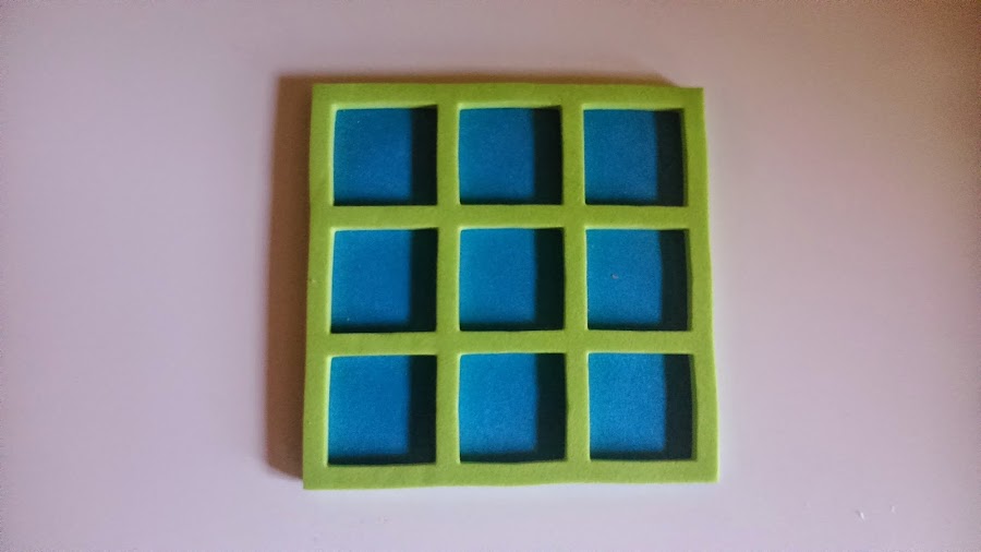 1. Coges dos cuadrados de "goma eva",si quieres de dos colores diferentes para diferenciarlos. En uno de ello dibujas 3 filas y 3 columnas en forma de cuadraditos enmarcados, y los recortas de forma que cada cuadradito queda enmarcado y separado de los otros como en la foto.