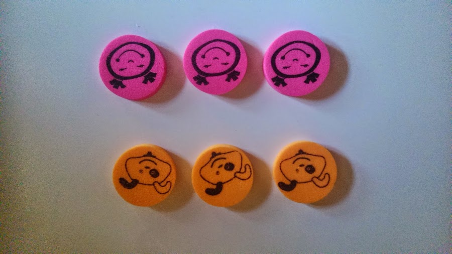 4. Por último, ya solo faltaría hacer las fichas. Coges dos colores diferentes de goma eva y haces 3 circulos de un color y otros 3 círculos de otro color, para diferenciar los jugadores. Asegurarse que los círculos caben dentro de los cuadrados recortados para poder jugar.