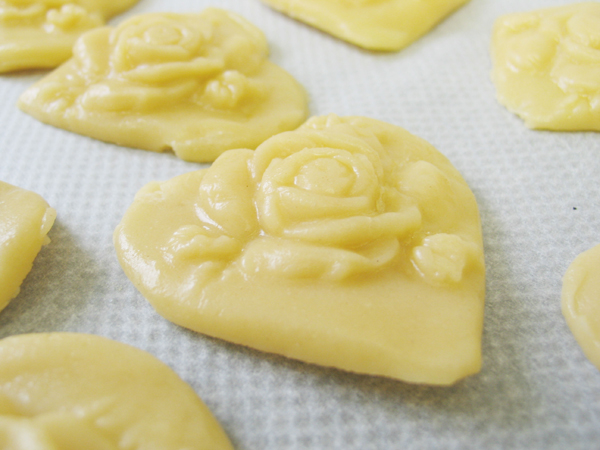 Retiramos con cuidado (es mucho más delicado que el fondant) y quitamos los bordes sobrantes con un cortador. En mi caso, elegí uno en forma de corazón.