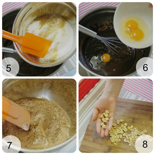 7. Juntamos en otro bol la harina, el cacao y la sal, y los unimos a nuestra mezcla haciendo movimientos envolventes con una espátula.