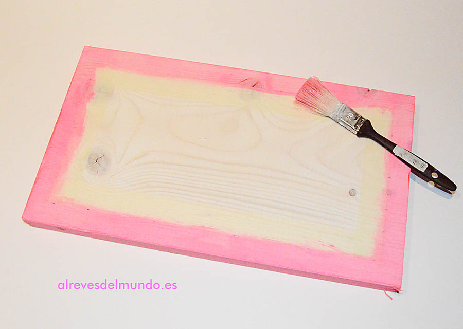 Pintamos la tabla con pintura blanca, un poco aguada para que se vea el dibujo de la madera