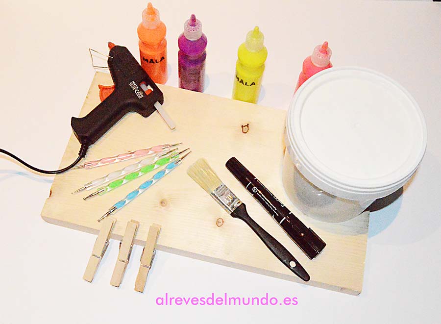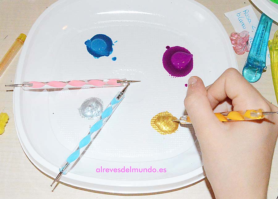Echamos un poco de pintura acrílica en una superficie, para ir mojando los punzones o palillos en su defecto
