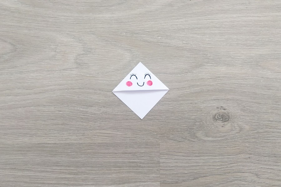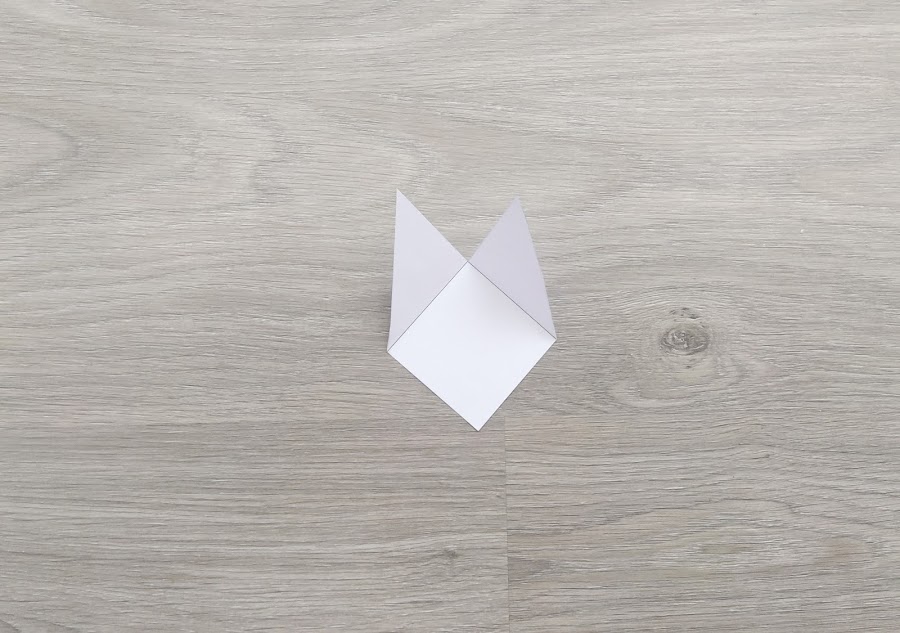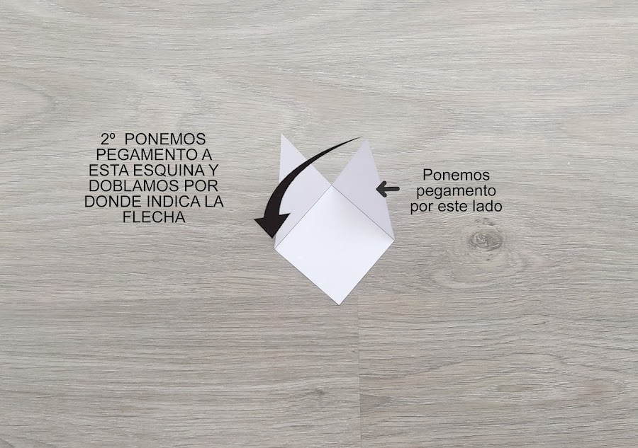 7. Ponemos pegamento en el lado indicado y doblamos la esquina derecha, llevándola al extremo contrario.
