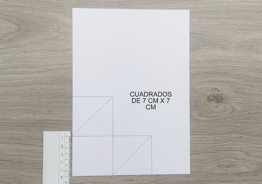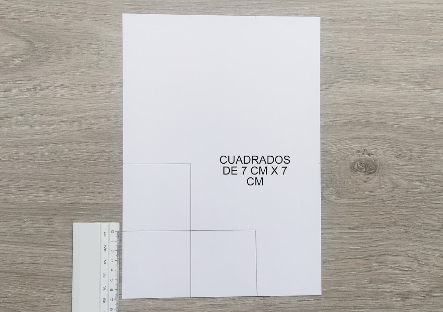 1. Lo primero que vamos a hacer es coger una cartulina del color que queramos y en ella vamos a dibujar con un rotulador, tres cuadrados tal y como vienen en la fotografía. La medida de cada cuadrado es de 7 cm x 7 cm.