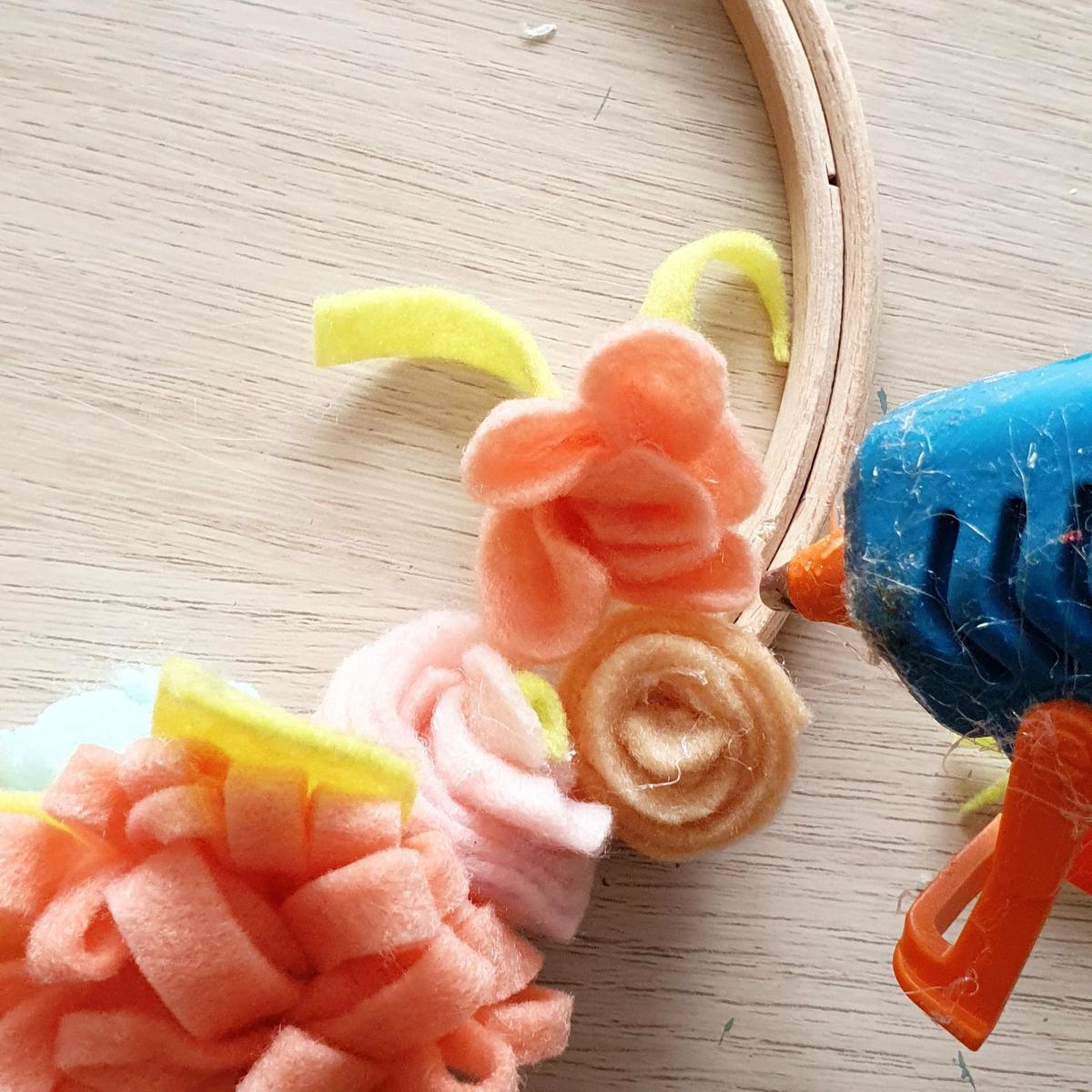 Pega las flores en el lado en el que se encuentra la tuerca que abre el bastidor y en el lado contrario, la cuerda para poder colgar la corona.