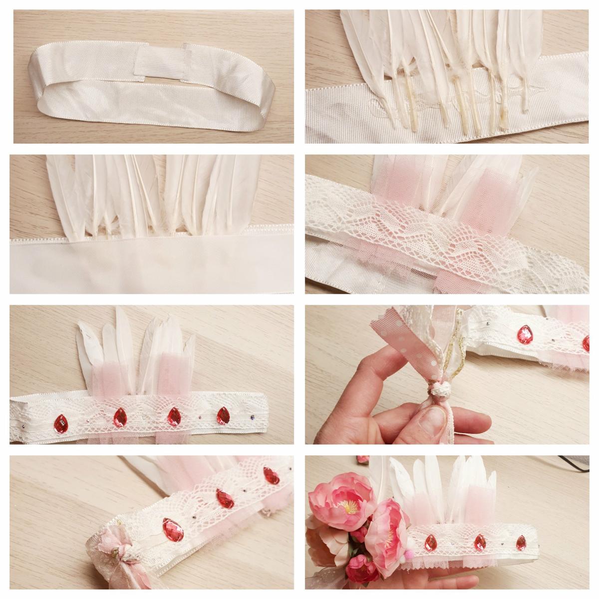 Para evitar que las plumas hagan daño en la cabeza, pega por el interior un lazo que cubra y remate la corona por dentro (este paso es opcional, pero no supone mucho trabajo y el resultado es más cuidado).