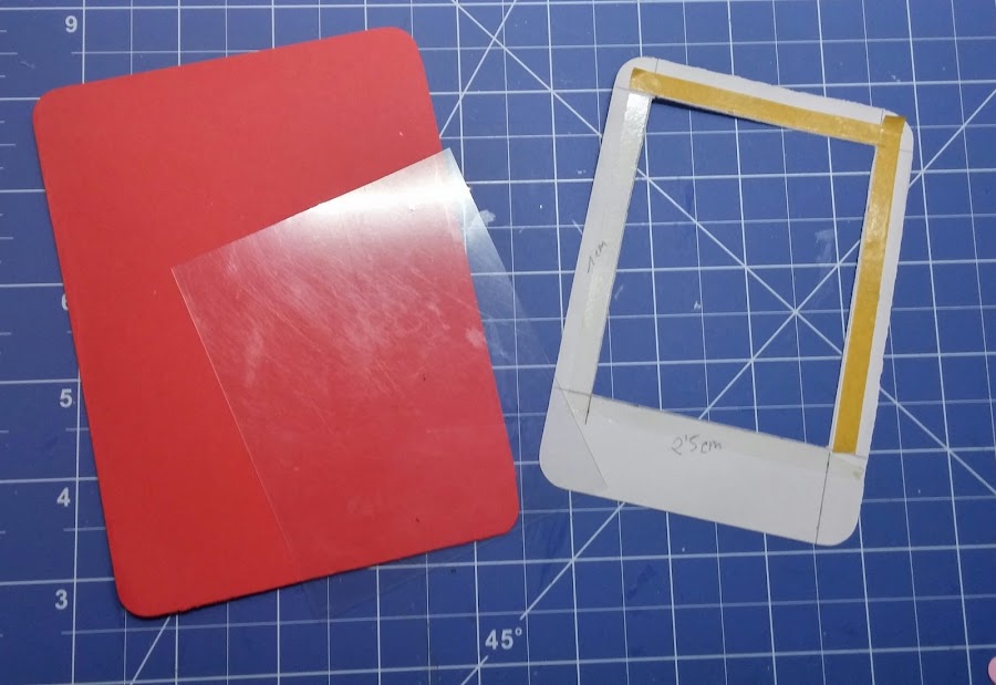 4. Cortamos del acetato un rectangulo de 10x8cm, que lo pegaremos por esta misma cara con cinta de doble cara fina.
