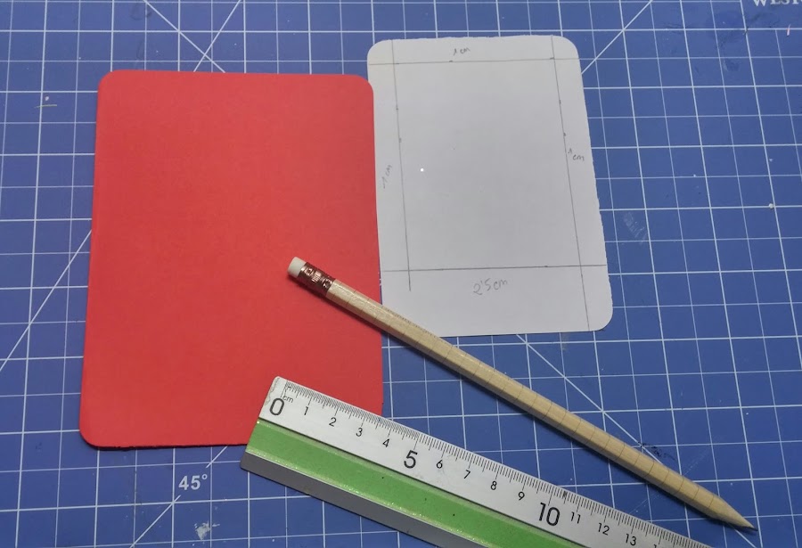 Cortamos la cartulina que actuara de base para la tarjeta en 21x14cm. Redondeamos las esquina.