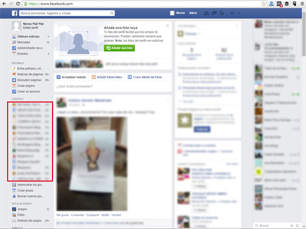 Los perfiles personales de Facebook, desde la página de "inicio", permiten "crear", "administrar" y "buscar nuevos grupos".
