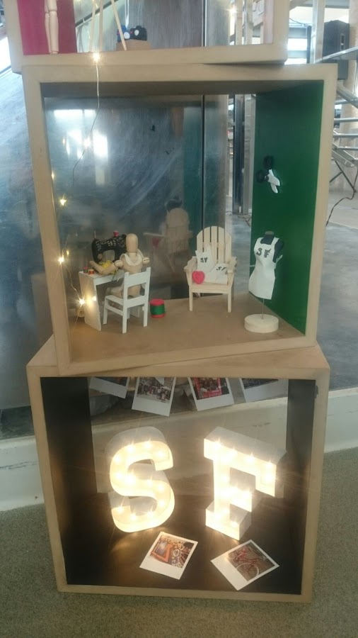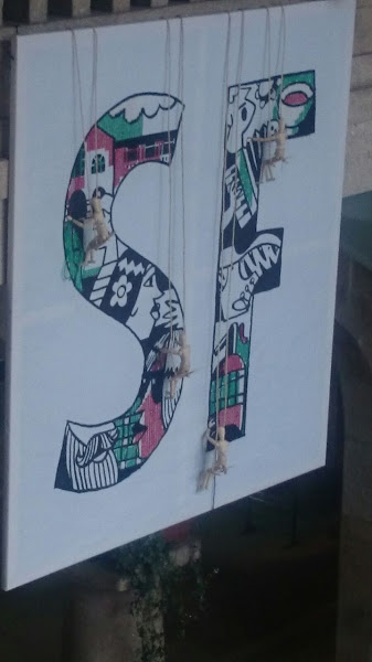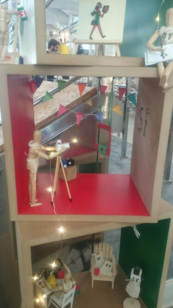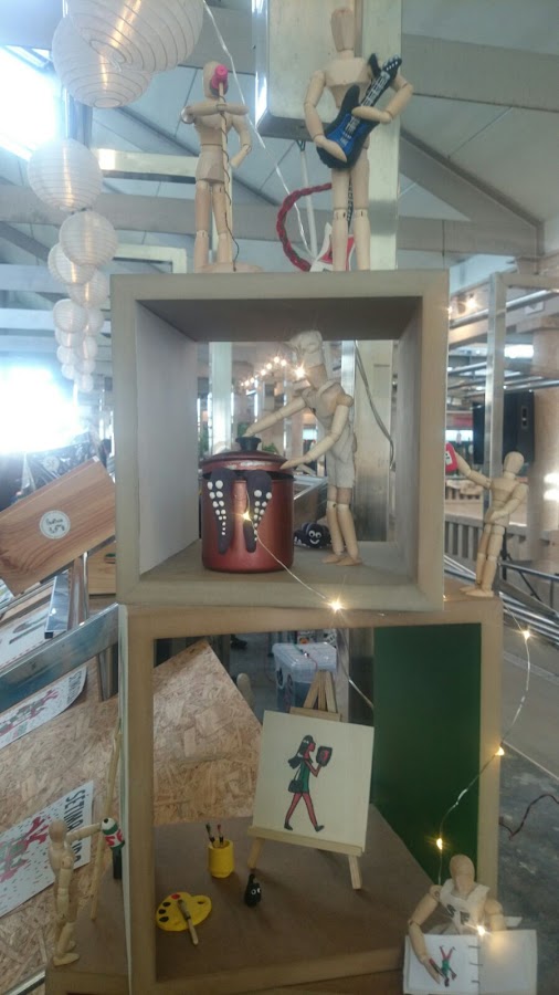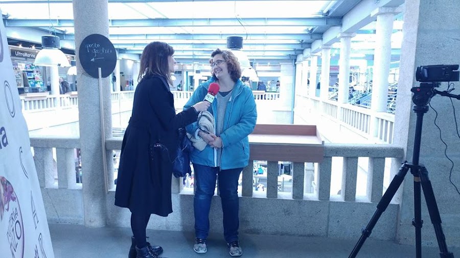 Lo primero fue saludar a Yoli, una chica super maja que conozco del instituto y que por X casualidades de la vida volvimos a retomar contacto, ella junto con un grupo de chicos y chicas forman el "Obradoiro de Emprego do Concello de Pontevedra 2016" cuya especialidad son la dinamización comercial, vamos que de lo que se encargan es e realizar dinámicas, promociones y publicidad (incluido temas de escaparatismo) para eventos o asociaciones públicas (en este caso para la Setima Feira en Pontevedra). En esta ocasión habían preparado ese mural tan original y laborioso en punto de cruz de la entrada. Además de unos cubos superpuestos que hacían ver que eran los diversos puestos con sus distintas actividades, me encantó, super original. Sin duda encontrarte con eso al subir las escaleras era el escaparate perfecto de lo que estaba uno a punto de descubrir, originalidad a raudales.
