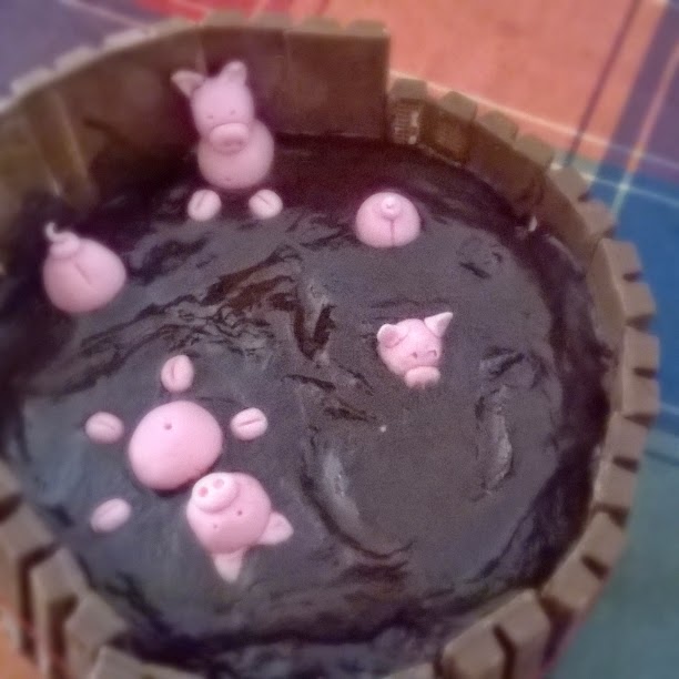 Se trata de un sencillo bizcocho de yogur ( 4 huevos, 3 vasitos de harina, 2 vasitos de azúcar moreno, 1 vasito de aceite de girasol, 1 yogur y 1 sobre de levadura química) Se rodea de "kit-kats" que sujetaremos con una cinta, lazo o cordel hasta que se endurezca el chocolate que los mantiene enganchados. Por encima echamos chocolate fondant, mantequilla y nata para montar, calentándolo hasta lograr una mezcla homogénea. Por último, y lo único complicado...hacer los cerditos con fondant de colores que podéis encontrar en todas las tiendas de repostería. Con un poco de maña y muuuucha paciencia, estamos seguras que obtendréis una tarta espectacular.