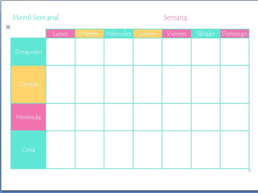 Lo primero que he hecho, es diseñar una plantilla de menú, para dejar por escrito lo que hay que cocinar en cada una de las comidas y ponerlo en la puerta del frigo para que veamos lo que hay de comer al día siguiente, o siguiente comida, y además apuntar si hace falta algún ingrediente.