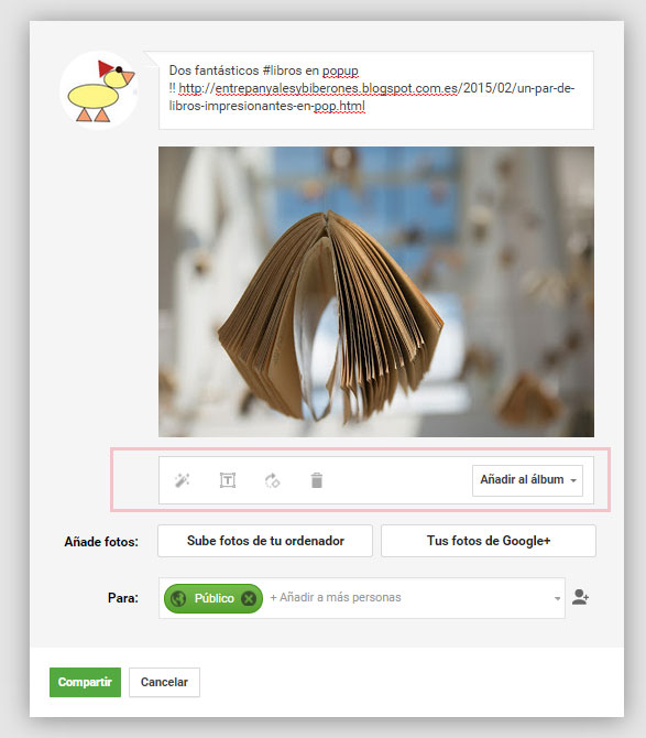 La forma de publicar es la habitual de Google+, la cual ya vimos al principio de este post.