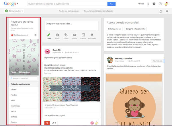 A continuación se te mostrarían en primer lugar las "comunidades que moderas", es decir aquellas que tú hayas creado, en mi caso, recursos gratuitos online, comunidad de Google+ en la de que te animo a participar, en ella compartimos un montón de freebies que estoy segura te servirán para muchos de tus proyectos !!