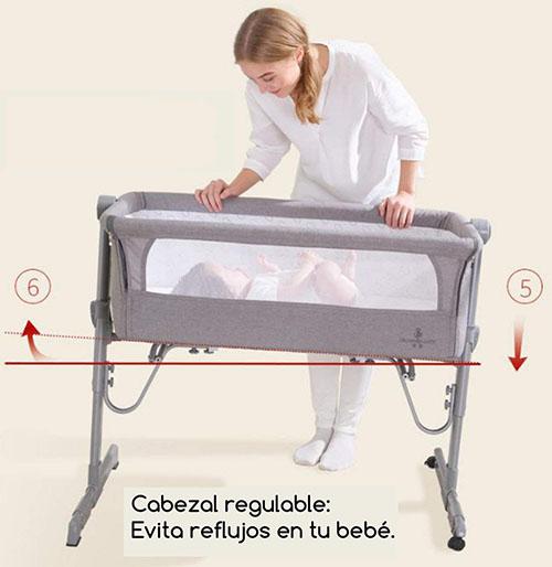 Es regulable en altura, tiene 6 posiciones para adaptarse a cualquier tipo de cama (de 35 a 52 cm). Además, al tener los reguladores a ambos lados, permite inclinarla. Lo que permite al bebé respirar mejor en caso de congestión nasal o para mejorar la digestión.