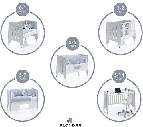 La cuna de colecho Alondra es con diferencia la cuna más versátil de todas. Aunque es una inversión más elevada, tiene 5 posibilidades distintas de uso, por lo que podrás utilizarla durante más tiempo. Esta cuna evolutiva ofrece 5 etapas: