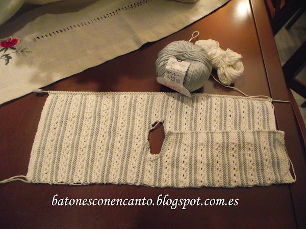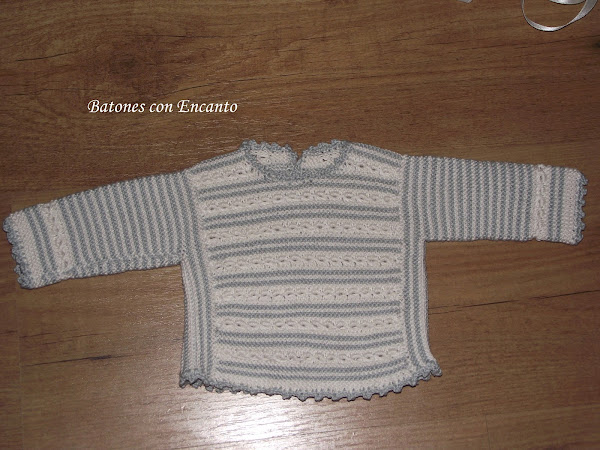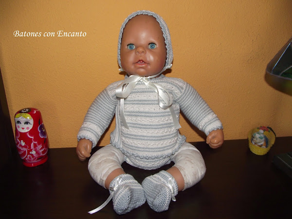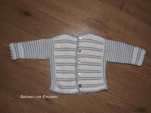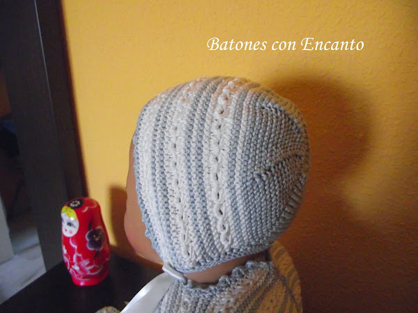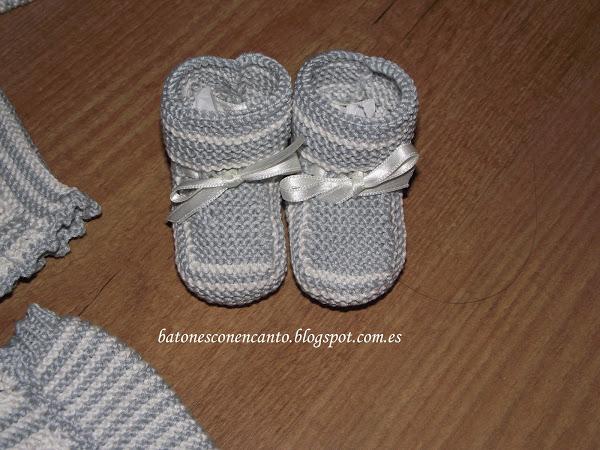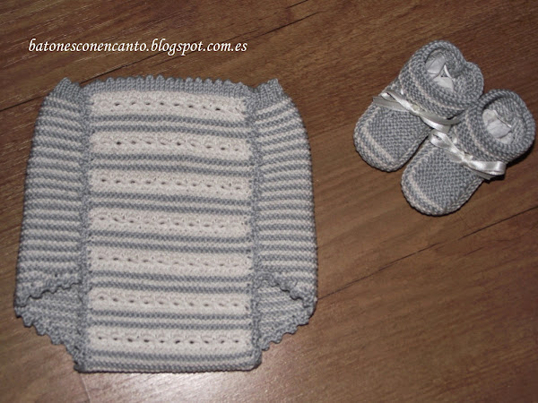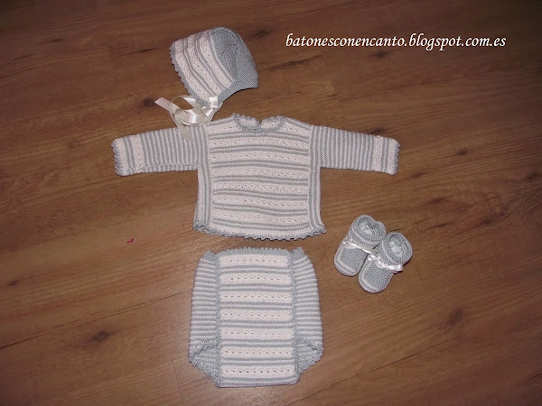 Os enseño un conjunto que he tejido para recién nacidos. Lo he hecho en hilo gris y blanco roto.
