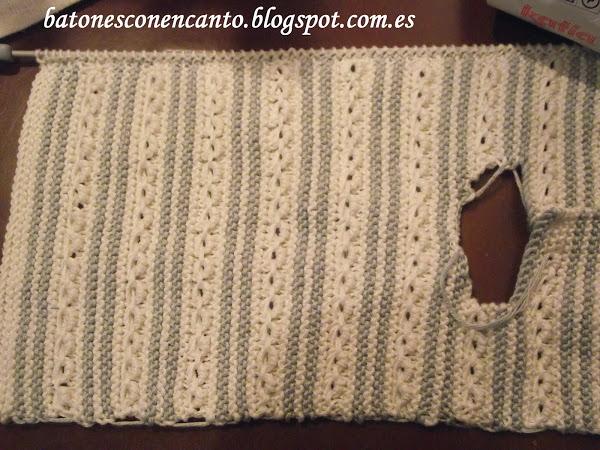 Hecho en punto bobo y punto de caracol. Las terminaciones las he hecho con una puntilla de ganchillo.