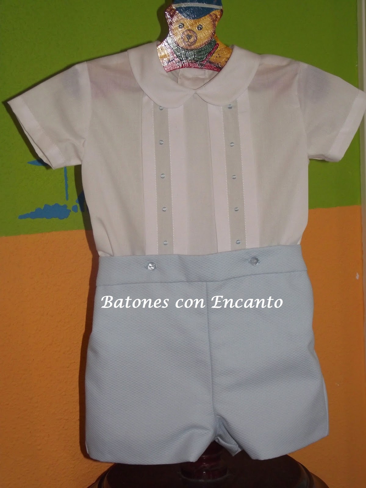 Hoy os dejo un nuevo conjunto de bebé. La camisa esta hecha en tela de batista con panetes bordados a mano en tonos celestes ajuego con el pantaloncito, que lo he hecho en tela de piqué.