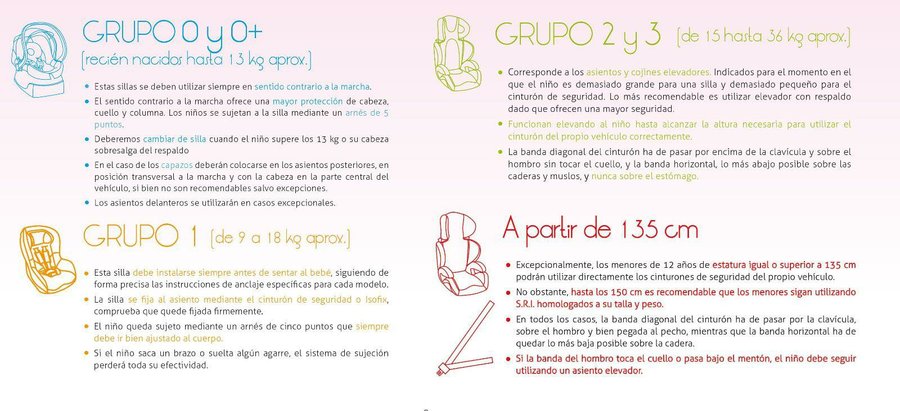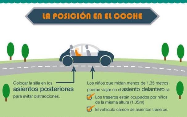 Se recomienda colocar las sillas en los asientos traseros para evitar cualquier tipo de distracción mientras se conduce. Los niños que midan menos de 1,35 metros no podrán viajar en el asiento delantero, excepto si los asientos traseros están ocupados por niños de la misma o inferior altura, no se puedan instalar todas las sillitas necesarias, o si el vehículo carece de asientos traseros ( 2 plazas).