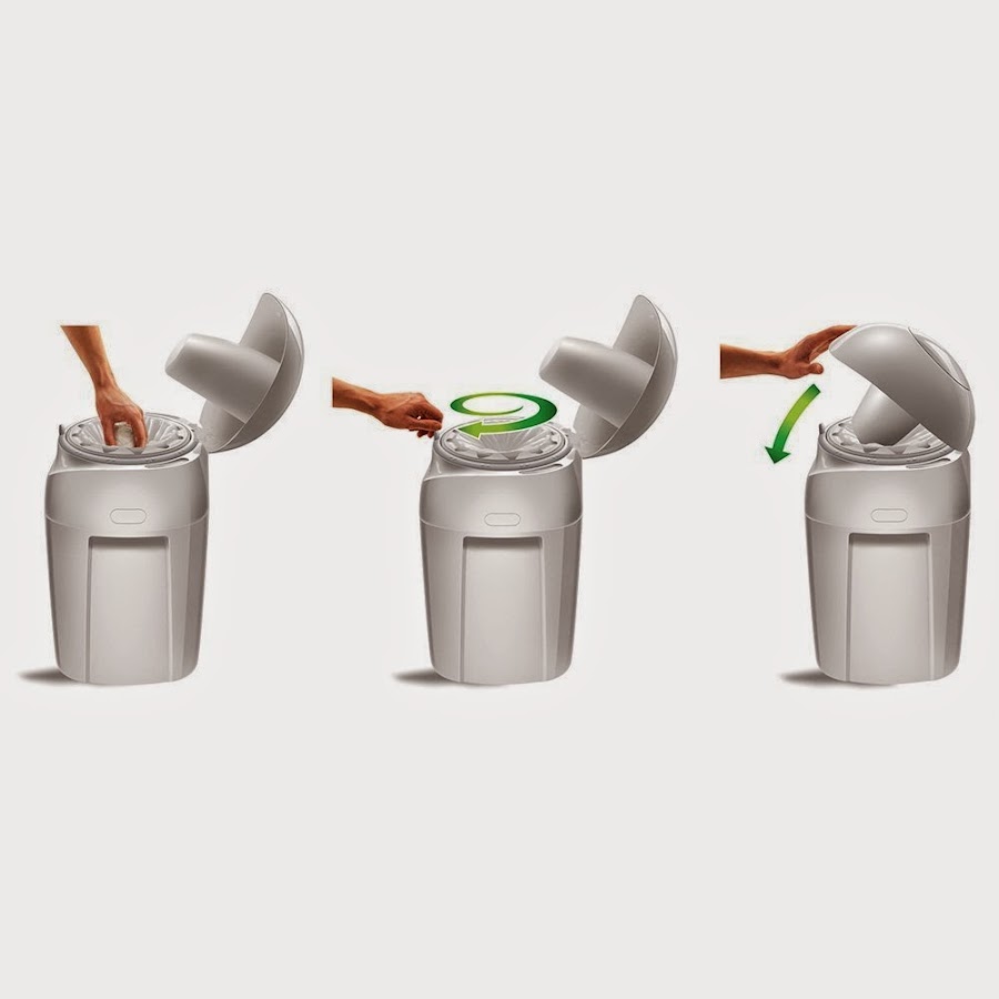 Su utilización es muy sencilla, introduces el pañal en el contenedor, haces girar una pestañita que envuelve el pañal para que quede aislado y al cerrar el contenedor el émbolo envía el pañal al fondo.