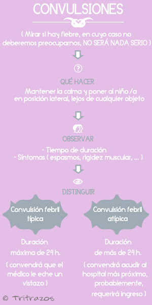 Pues bien, la historia comenzó en diciembre del pasado 2013, cuando nuestra nena tuvo su primera convulsión.... estaba en el Hipercor con papá que casi se muere del susto, iba sentada en el carrito comiendo pan y de pronto lo tira y se queda con un trapín, ... nos dicen que hay médico allí mismo, así que papá salió corriendo en brazos con ella - ya os había dicho en este otro post que era un súperhéroe, : ) - le miraron, le sacaron una miguita que tenía en la garganta pero seguía con la mirada perdida y no atendía a ningún estímulo (voces, sonidos, ...) así que le recomendaron que subiera con ella al Hospital de Cabueñes .... esa misma mañana a mi ya me había dado un pequeños susto mientras la cambiaba, se quedo rígida, con la mirada perdida y sin atender a mi voz ni a mis constantes llamadas, pero como se le pasó muy rápido y estaba como si nada pues no le dí mayor importancia, la verdad,.... Nos comentaron que si había antecedentes en la familia (y claro, a la mamá, o sea a mi me daban muy a menudo de chiquitina... así que blanco y en botella!! y es que ya se sabe, "todo lo malo se hereda"...), que en principio no había porqué preocuparse, que era un proceso normal en bebés sanos, que asustaba mucho, pero que carecía en principio de importancia.... y hasta ahí, esa ocasión, porque hubo otra, en enero, que fue cuando tras tres días convulsionando decidimos llevarle a urgencias, porque no nos parecía normal, .... y efectivamente, nos comentaron que a veces ocurría, pero no obstante que convendría dejarle en observación pues al durar más de 24 horas era calificada por ellos mismos como "atípica", no volvió a tener más convulsiones en el hospital , bueno ni en casa, afortunadamente, le hicieron un electroencefalograma para observar su actividad cerebral, todo correcto como sospechaban... así que nos quedamos mucho más tranquilos y pudimos, finalmente, llevarnos a nuestra nena para casita junto con los informes pertinentes y este papel informativo de la Sociedad Española de Urgencias de Pediatría....