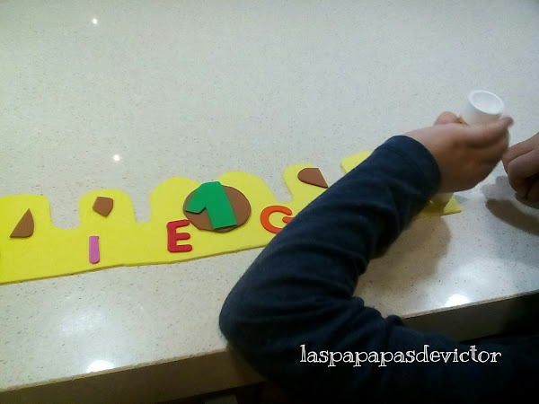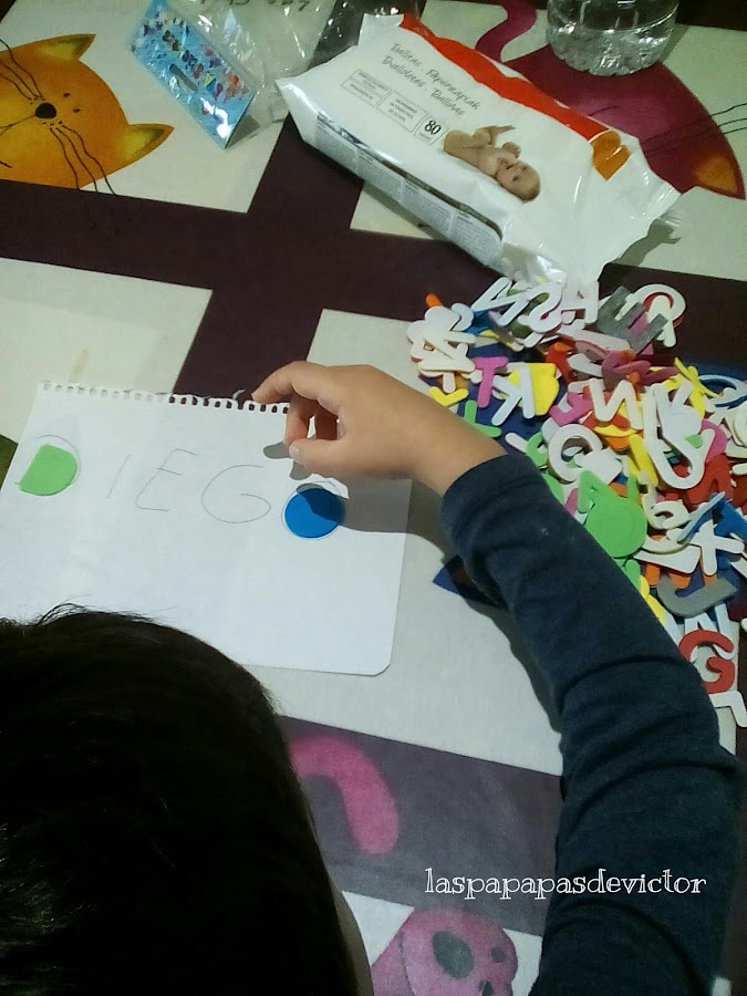 Tu peque que busque y encuentre las letras del nombre( yo le escribí las letras en una hija y el las encontraba y las ponía encima)