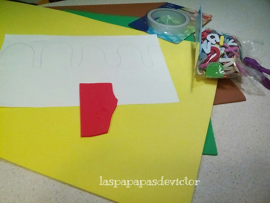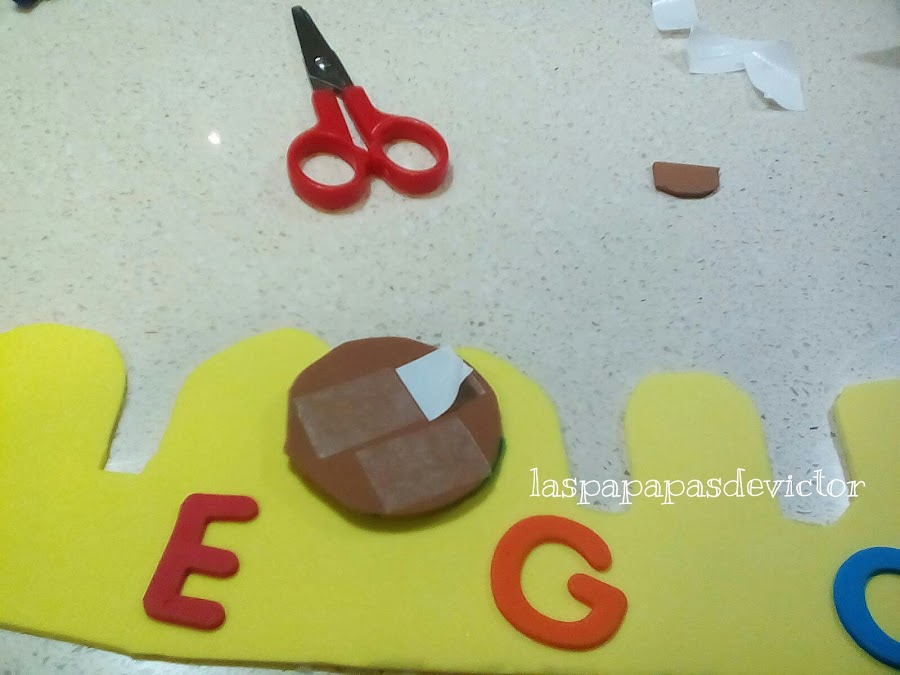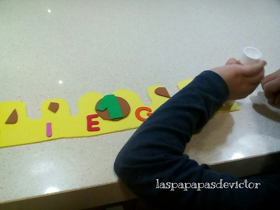 El lo pegó y yo le recorté trocitos de goma Eva en marrón y el iba pegándolas con pegamento, para simular las manchas de la jirafa