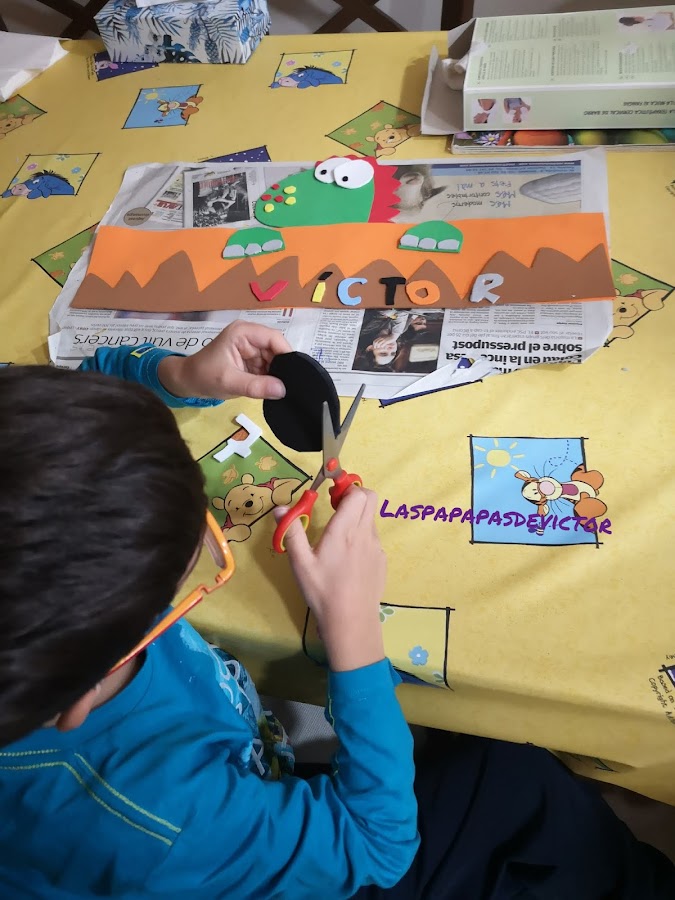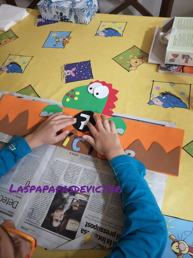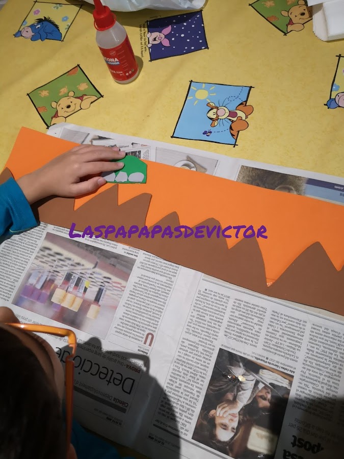 Le hice el patrón del dino y Le ayude a pegarlo y el acabó poniendo lo que quedaba