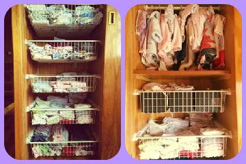 La ropita del bebé es muy pequeña y es complicado almacenarla sin hacer una torre modo tetris que en cualquier momento se pueda desmoronar, por lo que como no teniamos montado el armario optamos por poner los cestillos metálicos a lo largo de todo el armario . Esto sí, ha sido un acierto total, hemos aprovechado al máximo con ellos el espacio y nos permite tener ordenada la ropa sin acumulaciones y con fácil acceso a toda ella al extraerse los cestillos. Nosotros lo hemos organizado por tipo de prenda, en un cestillo los bodys, en otros los pijamas, en otro las camisetas, en otro los pantalones y en otro los accesorios ( calcetines, gorros...) dejando en la parte de arriba del armario una pequeña barra para poder colgar los vestidos y los abrigos.